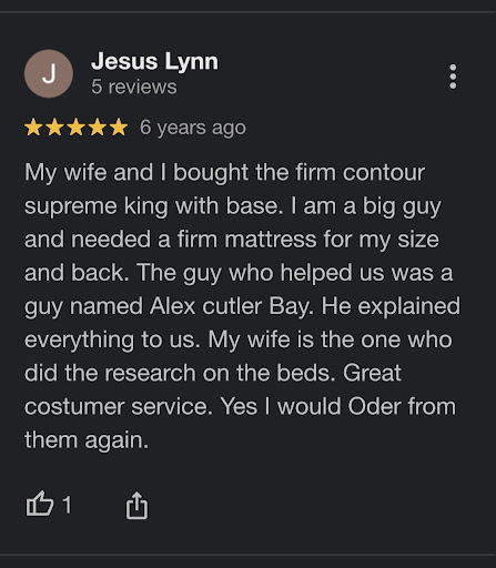 Dont be fooled by the great reviews they make you write a review when youre infront of them. Do your reseaech and shop around. They are not that professional. They do have good prices but you can get great deals right across the street at mattreass firm. I wish i would jave jist gone there from...