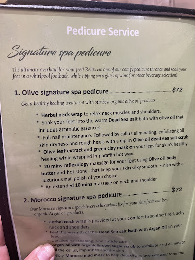 Read moreThis place is just absolutely top tier. When it comes to feet care I am VERY picky. This place never fails to satisfy me. My mother, boyfriend and I decided to come in today on a Sunday around 2:30pm, we waited a little bit to get seated. They ended up doing my boyfriends feet and he absolutely enjoyed every second of it, after him they did my mom and I. I ended up getting a manicure and one of the $60 dollar pedis with no knowledge that they closed at 5pm. Once I told them I wanted that pedi they didn’t hesitate to get started. I’m just absolutely astonished that they accepted me even though they knew how time consuming that pedi is. Anyway long story short, the wonderful lady that was doing my pedi stayed 20 minutes after closing time to gracefully finish my feet! I really wish i got her name:( but she is was just amazing, the amount of detail she put on my pedi even though they were closed was impeccable. I’m no new customer, i’ve actually been coming here for years, but this experience really opened my eyes and realized how kind people could be. It was seriously an honest mistake of mine that i didn’t realize they closed at 5pm on Sundays. 1000/10, Thank you Olive...