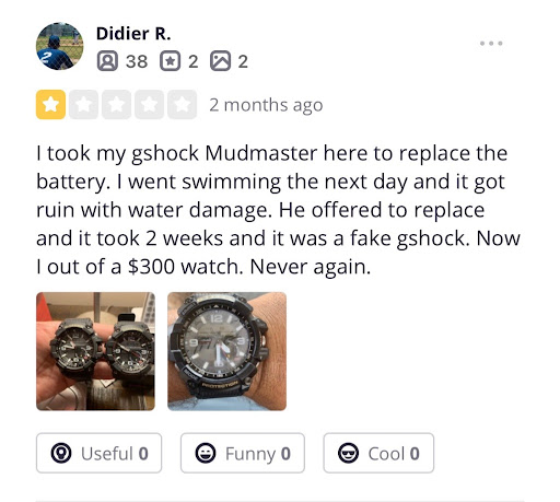 EDIT: after looking at the yelp reviews, which i should have done before, it appears this shop also ruins watches and replaces them with fakes. i'm convinced now that all these 5 star reviews were bought with discounted service, or were left by customers who didn't know they were being taken advantage...