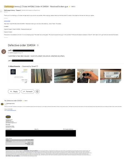 So I ordered a gun from Dahlonega Armory.. The gun was a Taurus 605 357 Magnum T.O.R.O. with an optics mounting plate and hardware.. The gun did not ship directly from Dahlonega Armory,, It was dropship from a place in Minnesota just as most of the reviews here alluded to.. I received no tracking information on the gun after ordering it.. Actually the gun arrived at my FFL without me knowing it had even shipped yet.. My FFL contacted me to come pick the gun up And when I got there the optics plate was missing.. I contacted Dahlonega Armory and let them know what was going on and they told me to contact Taurus.. It appears to me that this store has a very hands-off approach to customer service.. Everything wrong with something that you bought here has something to do with someone else other than them.. It appears that nothing is their fault.. I sent them a couple of emails in regards to other issues I thought I was going to have like shipping issues and they did in fact answer me immediately.. Like I said the gun arrived to where it was supposed to be in about the amount of time it should have taken without me having any knowledge of it shipping whatsoever though.. The box had obviously been open and the contents of the box definitely moved around.. The optics plate was definitely missing and the hardware was still there so I don't know why somebody would have taken that by itself.. I also don't understand why it would have been Taurus's problem to replace it If it had been taken out by someone else.. If I got the box and the gun was missing was Taurus supposed to give me another one?? Anyway this was the best price on the internet..The communication was in fact excellent..My only problem was them passing the buck at my time in need.. They have a 20% restocking policy which makes it just about impossible to send it back considering what my problem was,, which is why I believe they have this policy.. The overall experience would have been five star and this would have been a place I definitely would have gone back to but believe me when I tell you that will not happen at any price.. My only advice is shop at your own risk.. I could see why this place has very positive reviews as well as very negative reviews,, ones that I have to believe after my own personal...