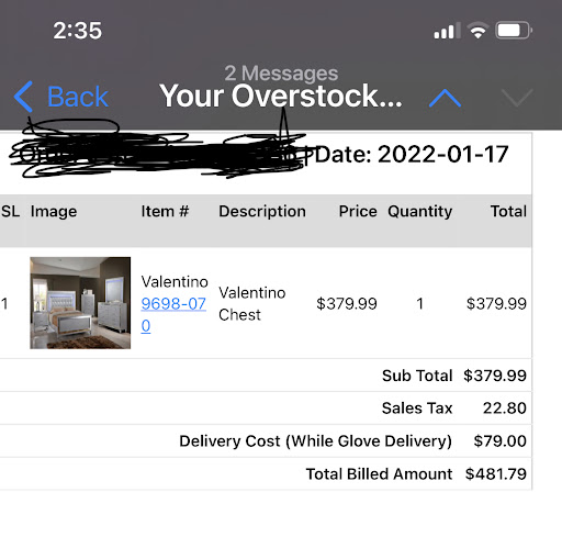 Read moreAVOID! First of all they were very misleading in the store with their free financing claims. It wasn’t until after I had already signed and given them the deposit that I was told they could only do 12 months of financing (when their posters and advertisements say 60 months). I purchased the furniture set anyway because I had my heart set on it. Second of all, I was told that I would receive a phone call within 10 business days about scheduling a delivery. I never received that call until I called them and got passed around to numerous people. Weeks later I was FINALLY to get in touch with someone to schedule delivery. I ordered this furniture in January and did not receive it until April. When my furniture arrived THREE MONTHS LATER. I was missing a night stand and the delivery men seemed to be totally clueless. So I had to again try to reach their horrible customer service to explain that I did not receive a piece of furniture. About a month later I received my missing night stand (which I had to take off work for a second day for delivery). The final straw after I had already told all my friends and family to never get furniture from overstock was: I was scrolling through my financing statements and I noticed that I had been charged an extra $215!!!! This company tried to STEAL over two hundred dollars from me. And if I hadn’t realized it and called them to correct it then they would have gotten away with it. Those of you who financed your furniture with this company, you better go back and check that your receipt matches what they charged you. Luckily, for the first time ever, this financial matter was handled with one phone call. Although the furniture is nice and the price was right it’s DEFINITELY NOT WORTH IT. It took so much time, energy and effort to actually get my furniture and on top of that they double charged my account. No thanks, look...