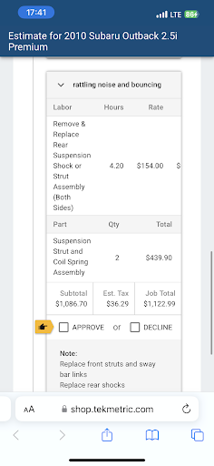 They updated my work mid repair asking to essentially replace my entire suspension (struts and coils) because there was a creaky noise. This was an additional $2000 on top of my original $1600 quote.