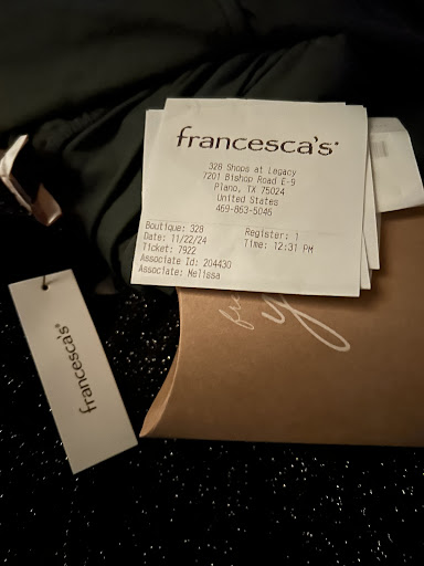 Read moreAfter having dinner @ Truluck last night I saw Francesca’s decided I would visit today nice small store. I do feel the worker was following us around the store, we were dressed very well and looking beautiful as usual. I went to the dress room area and there she was lol looking @sweater & jewelry there she was 🤣🤣 thank goodness more customers came into the store I noticed she went behind the register then 🤣🤣🤣 she did not follow them, however she was so nice when we spent 100.00 in that shop. I am not for sure if I will ever go there again because of that reason. #Born and...
