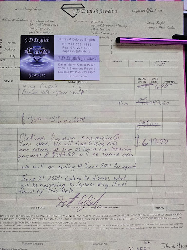 Below is a response from Dolores about missing my ring in their care. I dropped the ring off end of May, went to pick up June 13, and they asked I give them until June 21 to find the ring in their disorganized store and as of today, June 24, zero resolution or responsibility or ownership from JD English: