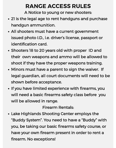 Read moreI would like to give my highest recommendation to Lake Highlands Shooting Center. I came into the range this week for a private lesson with Buddy Parker, Federal Law Enforcement Instructor and NRA Certified Instructor, and left feeling completely confident and full of knowledge—& the ability to shoot in pretty tight grouping. We spent time in the “classroom” learning about grips, stances, and most importantly-safety-before entering the range to shoot. In preparation for a new personal protection weapon purchase, I messaged Buddy and set up a time to come for instruction. His knowledge and professionalism was unbeatable. After shooting several of his personal handguns, he and (owner) Mark, made a recommendation on what to purchase. Although Mark could order what I need, he let me know about a less expensive way to purchase. I look forward to returning with my new handgun for another lesson in the classroom and the range. As a 30 year old woman, I felt completely comfortable and safe, as well as respected at Lake Highlands Shooting Center. Buddy also teaches a LTC class there most Saturdays, which I will also be attending. I couldn’t be happier with my...