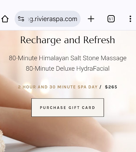 Read moreI recently had the pleasure of visiting Riviera Spa, and I can confidently say it was an exceptional experience from start to finish. From the moment I walked in, I was greeted with a warm and friendly welcome by the attentive staff. The ambiance was serene and inviting, setting the perfect tone for relaxation. The facilities were spotless and beautifully designed, providing a luxurious and calming atmosphere. I opted for a massage, and the treatment was beyond amazing. The massage therapist, Trey, was highly skilled and attentive to my needs, ensuring that I left feeling completely rejuvenated. One of the standout aspects of Riviera Spa is the personalized service. The staff went above and beyond to make sure I was comfortable and satisfied throughout my visit. Their attention to detail and genuine care for their clients truly sets them apart. Overall, my experience at Riviera Spa was nothing short of spectacular. I highly recommend this spa to anyone looking for a top-notch relaxation and wellness experience. I will definitely be returning for more treatments in the future. Thank you, Riviera Spa, for an...