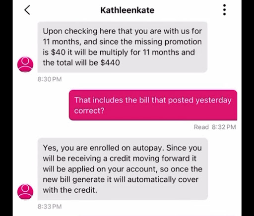 ⢠We noticed charges for the 3rd line ($40) every month from May 2023 - current date. ⢠We contacted T-Mobile support via chat and spoke on the phone with supervisor on April 17th. The chat rep and supervisor confirmed the promotion wasnât applied and promised a $440 credit and correct billing moving forward.