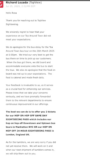 Lack of Tour Experience: There was zero commentary on the sights or any historical context. Aside from a single intercom announcement about keeping lids on cups, there was no engagement at all. It was basically just snacks on a moving bus.