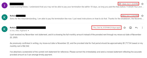 After weeks of coming to a conclusion, they lowered the reletting fee to $1400. Still wanting to suck every penny out of me. Lydia (General Manager) informed me that Hilary (Area Manager) would allow me to take my time paying back the owed amount. “Take all the time you need, sorry for your loss”.