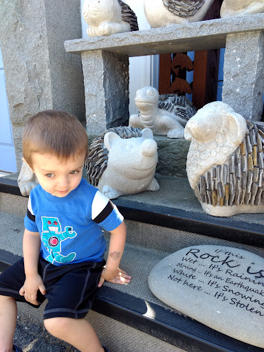 On our way out, my two year old had to pet all the little stone creatures on the stairs and asked for a photo with them. Unfortunately, that was the only picture I was able to take here, since... Well, I was watching a two year old in a pottery shop. ;) Trust me when I say that you just have to stop in...
