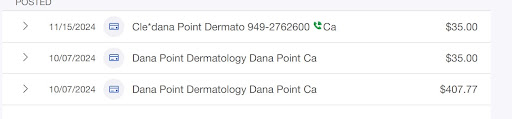 I've attached the screenshot of my card transactions so you can see the double-billing of a $35 co-pay. Notice how they waited over a month to charge me again. I am also notifying my health insurance this is wrong, as there was no appointment or visit other than the one on 10/7. Even though I was very unsatisfied regarding the skin cancer screening and insane pricing, I was not going to leave a bad review (or any review) because I generally don't do that, even if I'm unhappy. But after discovering the fraudulent billing this morning and having to spend my day off from work communicating with credit card company and health insurance, I felt I shouldn't keep this experience private, as that was the last straw.
