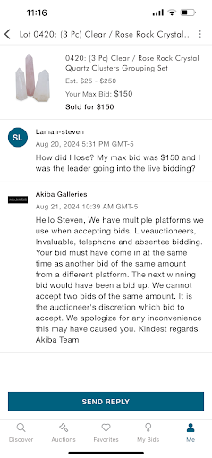 Read moreI would not bid with them via Live Auctioneer. They will accept the same bid amount either through other platforms, absentee or by phone and these will trump the bid via Live Auctioneer. I was the listed leader and a lot and someone else won the lot with the same bid, no notification. Asked the auction house about and got this reponse ( see below ). Basically if a tie occurs, the auction house at their discretion, will pick the winner and it must not be Live Auctioneer bidders...