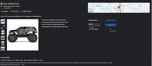 Some of these reviews and ratings are ridiculous... in this internet age you can order parts and kits online. I used to order online but realized if I order a kit or part online and I have a problem who’s going to help me? when you need help upgrading, installing, diagnosing etc the small store like GH will be more than happy to help. Most stores today do not stock ten million kits bc at $200 - $1500 , they would have to raise prices to cover that cost since a lot might take a year to sell... Better to have them keep the cost low and just wait a couple days.. They DO have boats, crawlers, cars, helicopters etc. do they have EVERY kit? No, but they have every part I’ve needed / wanted and ordered me crawler tires in 4 days. Owner Leo is so helpful and honest , I didn’t know he was the owner until today! Just bought a Charisma Coyote for a song after upgrading my Vaterra K5 Blazer to the max with these guys! The one star review guys can order online and stay away, you just waste everyone’s time complaining but run to a B&M when something breaks 😒 Order your part online and when it doesn’t fit see how long it takes to send back and get a replacement.. LOVE Goat H...