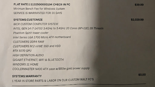 My issue with the parts list is the lack of itemized pricing and vague descriptions (e.g., “High-Definition Audio”). I expected a detailed list for a ~$2,300 system. Using PC Parts Picker and Amazon, I estimated the parts should total about $1,640 (excluding Gigabit Ethernet, Wi-Fi & Bluetooth, and Windows 11 Home). I was also puzzled by a $140 motherboard without built-in Wi-Fi/Bluetooth and by the Windows 11 is normally marked up to $100. My estimate is around $1,740, yet they quoted $2,218.84—roughly $400 extra. Their labor charge (2.75%, or $55.82) and a $133 Volusia County fee bring the subtotal to $1,930, leaving about $200 unexplained. While $200 may be minor, the overall pricing and vague details raise questions.