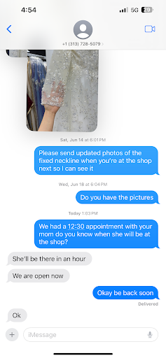 To make matters worse, the shop owner (who initially offered to do the alterations as a gift) left the country without telling me. From June 14 to July 6, 2025, I asked her daughter multiple times for progress photos of the dressâshe refused, saying she was âtoo busy.â Then, after all this, they tried to charge me $200 for incomplete and unprofessional work.