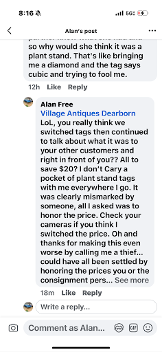 Read moreWent to Village today to get my wife a birthday present and she finds a wooden old hat stretcher that was marked $25 and said it was a plant stand. We go to the counter to purchase it and a guy asked my wife what that was. She begins to tell him about it and the owner overheard her. So when we get to the counter she says it’s marked wrong and the price is $48 . She said someone must have mismarked it. I was also buying a model boat with trailer and she said that the boat is one price and the trailer another.very shady place that’s really gone down hill, maybe that’s why most of the items have been for sale there for years. Better luck somewhere else that has integrity in their pricing. We walked out not buying anything and my wife was pretty upset on her birthday, thanks Village Antiques. Then she continued to call me a thief saying I switched the tags… stay far away from this place…well unless you like your integrity...
