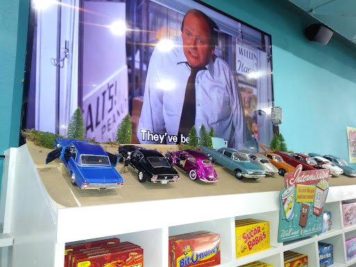 This place is wild! They have every American candy and soda pop that was ever made or almost anyway. I was awwhed by their large selection. They make their own waffle cones and ice cream. I had a traditional cone with a mouth watering dip of German Chocolate ice cream. Wow! I noticed some model cars sitting on a shelf in front of a tv but soon realized it was a miniature drive in cinema and the tv was the big screen. Adorable. There is something for everyone here. The staff were exceptionally helpful and friendly. A definite stop for those visiting. The staff also directed me on this sleepy Sunday afternoon of a few other places might like to visit. Worth a look & for some of us a look back to our childhood...