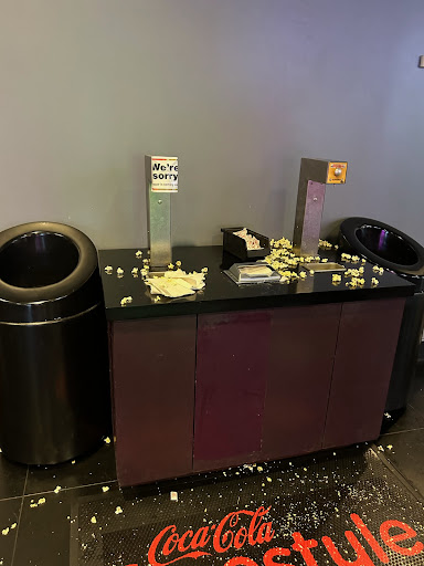 This review is based on several recent visits. To put it simply, this theater is need of new management. Years ago this theater was great, but now its just a mess, very literally! No matter what time of day you are here the theater has piles of trash and garbage everywhere. You would think that when the theater first opens that bathroom areas would be clean, and the popcorn stations would be straighten up as well. Nope, please see my attached photo. This was taken just after opening, and was in the same condition if not worse 3 hours later. Same with the restrooms. Its no wonder many reviews have mentioned rodent issues in the theaters. Other issues we have encountered recently were trash left in our seats from the previous the showing. I do not mean pieces of popcorn and candy left behind. I am talking half eaten buckets of popcorn, water bottles, candy boxes, and napkins left. The chairs were still even reclined. It was very clear the theater had not been cleaned since the last show. There was also a group of 12/13 year old boys constantly on their phone making phone calls, and playing music loud during the movie. When someone from our group went to get a manager, or staff member to have them removed, no one was found or available to come. Lastly, on our most recent visit something was seriously a foul with the popcorn butter. It was cold and tasted and smelled rancid. I brought this to the attention of the gentlemen at the concession stand. He said the heater for the butter was off and gave us new popcorn. He did turn on the heater, but did not change out the oil/butter. He didn't even check it. Another patron who was near me commented on how awful the butter tasted and through her popcorn away. I am not surprised to see in another review someone mentioned their family becoming ill. This place used to be so much better. Its clear staff is not trained properly, nor is there any accountability going on. It is theaters like this the are just ruing the movie going expierience. No wonder so many would rather...