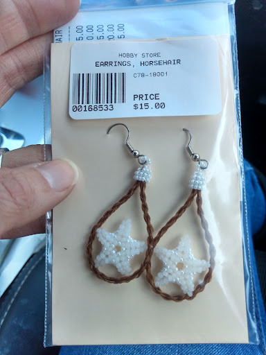 They have paintings, drawings, crochet and stuffed animals and hats. Leather products like bracelets, necklaces, wallets, bags, hats, sheathes, key fobs, bridles, belts, and rattles.
