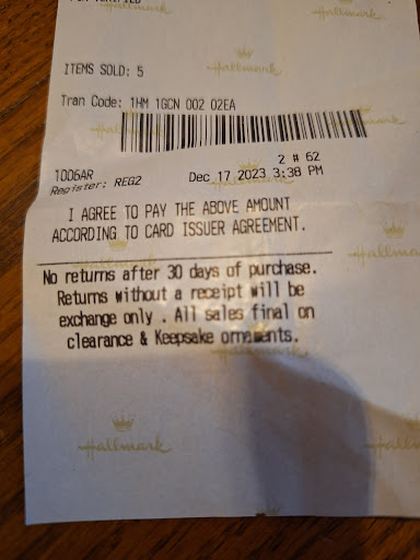 On December 17th, I visited a Hallmark store with my two children to buy annual ornaments for their mom. Unfortunately, the first store didn't have what we were looking for, but we found the ornaments at a Mason store. Along with my boys choosing ornaments for themselves, we bought a total of 6, including 2 duplicates. Attempting to return the duplicates on December 26th, I was informed of a no-returns policy, posing a challenge as it's difficult to identify duplicates before you give them as a Christmas gift. Consequently, I'm now faced with selling the sought after duplicates on eBay. I also note that Hallmark's store signage doesn't address the no return policy. It is only on the receipt after purchasing. Ornaments are primary reason people visit Hallmark during Christmas....