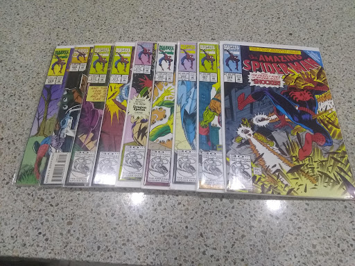 Big open spaces with tables and chairs, you feel welcomed and comfortable sorting through. Will say the cards in the case are a bit of a challenge to see, and once priced, they dont seem to update with the market changes. But no real complaints.