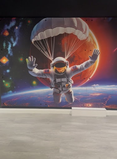 Step inside and the space is clean, modern, and open. Polished floors, bright lighting, and well-placed display cases make it easy to move through. The star of the show is the giant wall mural of an astronaut parachuting down over Earth with a glowing planet behind him. It’s more than a cool backdrop. It locks in the vibe of the brand perfectly. Big, bold, and on theme.