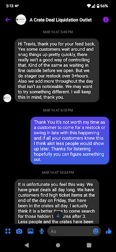 I have been here several times and also purchased several pallets at the BIG Crate Store. This place isn't worth spending your time at half the items are broken and no exchange/refunds. I have seen the restocks get handed to people just camping and waiting for hours so when they post on Facebook that a restock is happening don't bother cause 5 other people are waiting in the store for these items. I did offer suggestions to handle the restocks better but was told to not worry about it. Then I got removed from posting within the FB group cause I asked a question what kind of business does that? Talk about avoiding the topic! Disappointed and doubt this store will make it long treating customers this way..... disappointed in A Crate Deal here....Here is a screenshot of our conversation so everyone can see what was really said here. I don't understand why you won't listen to feedback to...