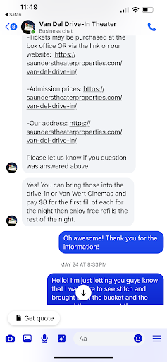 Read moreWell it's been many years since I've been to a drive in. They had great prices and friendly staff. They had a 50-50 drawing, another drawing, sub eating contest, smash a window to the highest bidder. It was a clean place. The only down fall and I get why but I have to tell you the they have porta cans for their bathrooms đ» and I only seen two and they were the regular size. ones not made for handicapped. Would I go back??? Yes, yes I would. If you go would you please keep in mind that yes it is cheaper đ to bring your own food but if you buy their food it helps keep them open and they are a dieing breed and with this virus we are not able to do much of anything you sure can not to to a in door theater to see a movie but you can sit in...