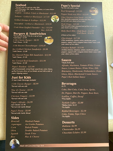 Read morePapa has potential. The service was good, however, we were not presented with dessert options at the end of the meal. I ordered the shaved prime rib sandwich, which had good flavor, but the bread they used was the table bread, which they give before the meal with butter. As good as that bread is, it was awkward and not substantial enough for the prime rib sandwich. The french fries were very under cooked and white and not edible. The sandwich should be served with Au Jus, but none was offered, or to our knowledge, even available. The kids had chicken strips, which were very bland and needed salt, although they appeared very good and substantial. Overall, with a few tweaks and adjustments, Papa Nick's could be a strong hit...
