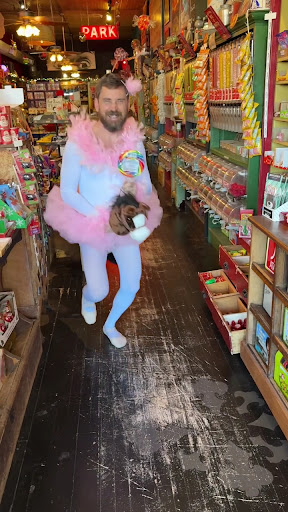 As if that wasn’t enough, they handed him a stick horse and sent him galloping up and down the aisles. His ruffled bloomers bounced with every step as he pranced through the store, reins in hand, looking equal parts ridiculous and weirdly committed to the role. The staff was loving every second, encouraging Mitch to keep going while laughing so hard they had tears in their eyes.