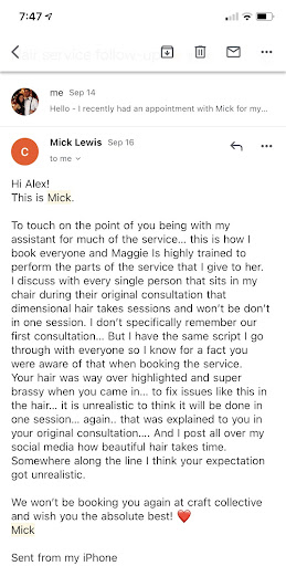 What was most disappointing about my experience at Craft Collective was that after spending over $800 there, I could not get anyone to speak with me on the phone. They texted me back to let me know that their policy is that adjustments have to be made within the week but that a toner appointment could be made for $180. I was a little confused because a toner appointment seemed like the suggested solution was taking it back to how it looked when I left the salon, which I hadn't liked. I texted back saying this is a difficult conversation to have via text, would it be possible to hop on a quick call. They continued to text back and reiterate the options of a toner appointment or seeing another stylist. I would hope that after such an investment that a phone call to try to help better understand the issue at hand would be a minimum level of effort.