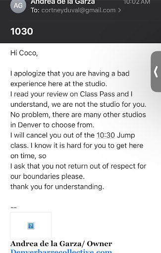 I love ClassPass because I can take a bunch of different barre classes from all over Denver and this one had great reviews so I was eager to try. signed up for 3 classes at Denver Barre Collective at the same time for the next upcoming days. I came 10 minutes early today to the 10:30 trampoline barre class and had a smile on my face because I was now prepared for the aggressive style of teaching with the same instructor from the day before, but she pushed her palm in my face when I entered the door. She said she emailed me a few minutes before class (mind you city driving and parking for me) that she didn’t like my review from yesterday and so I’m not allowed into class today and if I tried to stay she’d call the cops. I asked if she could explain more she said “I didn’t do 1,000 reps that’s inaccurate” and that’s not what I said either but then she started recording me and so I got my phone out to protect myself since she’s threatening cops. She calls the cops but they never came, her lips were pushed out as far as her ego pursed on her high horse today. It’s sad when you use your status to put other people down. Crazy the world we live in after 2020, I’ve heard it called status anxiety today and that seems fitting. My brain was just looking out for other people like me who would have liked to know my ClassPass review I wrote. Regardless she never gave me the respect to say to my face whatever was in her email I posted which was vague and another who trip. She had her assistant who previously said she didn’t want to “be in the middle of it” be the one to address it with me outside because she could give two minutes of her time to authentically communicate what her issue was with me herself. She was anything but professional and it’s unfortunate she subjects so many people to her narcissistic behavior.