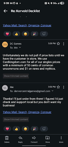 Read moreDecent enough place, but overheard employees discussing a 2% flat fee on all credit card transactions. Considering they already charge the highest card prices, cannot recommend buying singles or packs from them. They overcharge for 'market value' (read: what scalpers charge on amazon) on sealed product often. Many of the reviews commenting on the rude staff aren't entirely off point. You /will/ get an attitude from the male staff member previously mentioned. Customers are seen as an inconvenience. Store probably hasn't been cleaned since I started coming for events several years ago. Decent enough place, but with all the negatives piling up, can't really claim it's a convenient spot to play with friends anymore. Support any of the other shops that actually have passionate employees, the ones here just want to rummage through the piles upon piles of cards (and make you dig through them if you ask for a card that's not easily findable.) Huge IDGAF attitude from most of the employees, which outweighs the one nice person here. Major attitude problem. Major pricing problem. Don't let the convenience convince you to support them. As a patron that's spent probably /far/ more than I should have on singles, I will not be supporting them financially anymore. Having a public area to play magic with friends gets them the second star. ((Minor edit: I will give them that they have cards in stock often. Rare I can't find what I'm looking for. Which isn't much considering you can just order online for cheaper, and without any of the attitude. Which I will be doing...