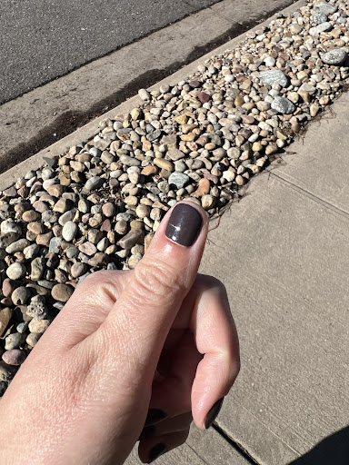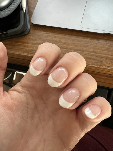 My nail tech started very methodically with the white paint, drawing it on with a super small, precise brush. It was a little thick but nothing to complain about, I was happy. Then her next client came in, and I felt the pressure for her to move faster. She stopped using the precise brush and went for a thicker and quicker method. It unfortunately showed - there's stray white lines, the white is streaky and see through in some places, and the lines are uneven across the nail. Also left with a few cuts on my fingers, paint on my skin, and my nail beds/sides of my nails didn't get cleaned up at all.