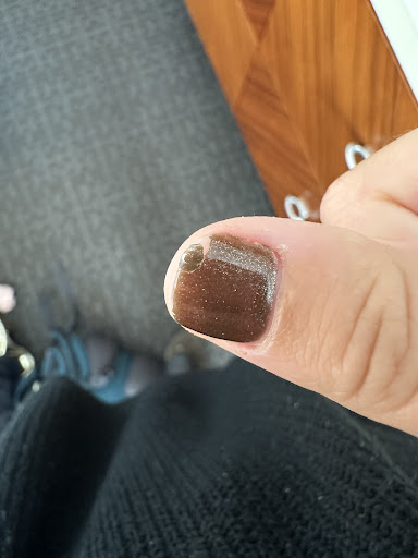 However, I still felt a bit rushed - the application of polish was patchy (since it's a darker color), and some top coat pooled over the edge of my nail, causing some peeling. The tech put on two coats of color, and in my picture what looks like a shine on my pinkie nail is actually just my natural nail showing through.