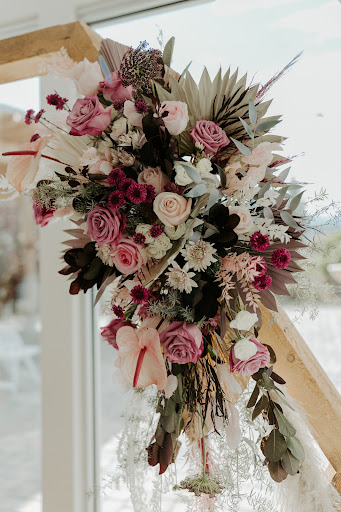 Ruffly Rose did an incredible job with our flowers for the ceremony (bouquets, corsages, boutonnieres, etc) and flowers for our wedding reception. We found and booked with Ruffly Rose late in the game before our wedding, and we had nothing but a good experience with Emily (the owner/head designer) and her team at Ruffly Rose. With my sister’s help, we gave Emily and Ruffly Rose a very specific vision for our flowers for our wedding, and she delivered incredible flowers and incredible pieces. Emily took the time to do a call with us at the beginning of the planning process to create a detailed itinerary of the items we wanted for the wedding day. Then, Emily graciously updated our invoice as we added and took out items as we continued our planning process for the wedding day. Also, Emily is very amenable with you bringing in items to include in your wedding flowers--for example, we brought in ribbons to use to tie the bouquets and my now-husband tied fishing flies that Emily incorporated into the boutonnieres for the groomsmen. Emily is very conscious of the importance of wanting to stay on a budget, and she doesn’t pressure you towards any “must-haves” for the wedding. For mid-range prices for wedding flowers, Ruffly Rose is the obvious choice for a wonderful wedding experience. Keep in mind: Ruffly Rose not only does wedding flowers, but also runs a brick and mortar store, so be patient with response times in emails. Pictures of the arbor piece that Ruffly Rose created, the centerpieces, the boutonnieres, and my bouquet...