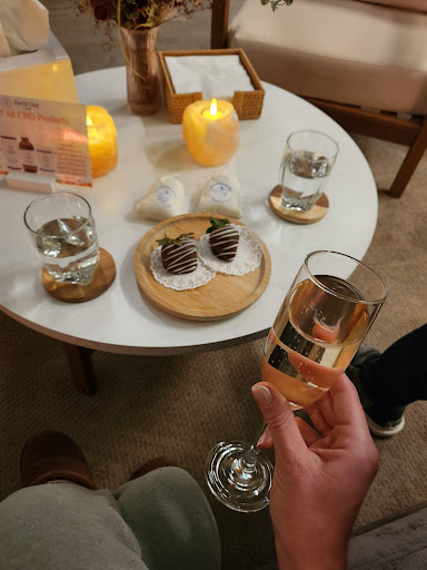 Read moreMy fiancé and I came out to Zen'd Out for a couples massage to celebrate our engagement. When I tell you it's unfair to have to cap our rating at 5 stars, I mean it. My fiancé and I have both had many massages, typically walking away feeling indifferent - they always feel good during, but we don't usually leave feeling any different. When we walked into our massage room, rose petals covered the floors and roses were placed on the massage beds. We got to smell and choose which aromatherapy oil we wanted and choose any additional add-ons to our massage, like facials, CBD massage oil, cupping, etc. We had Elena (I hope I'm spelling that right) and Abby as our massage therapists. They introduced themselves and took a moment to ask us individually about injuries, areas we wanted to focus on, what we were wanting, etc. After that, they left the room for us to get undressed and settled onto the heated beds. When the massage was over, my fiance and I looked at each other and agreed they might have been the best massages we've ever had. Some parts of the massage felt painful, but with immediate release and relief afterwards, which is exactly what I was hoping for with the deep tissue I requested. I especially loved the focus on my glutes, quads, and feet. My fiance noted how Abby, his therapist, guided his breathing with her own breath work that really helped him relax and release. After the massage, we were offered hot towels and were greeted with champagne and chocolate covered strawberries. They also offer bellinis, mimosas, tea, water, etc. Our therapists took a moment to come over to us and discuss areas of tension they noticed in our bodies and ways to help alleviate that tension outside of massage. They congratulated us multiple times on our engagement, which, as a newly engaged couple, it's all we want to hear and talk about, so that meant a lot to us. We were sent home with little bags of scented Epsom salts. Overall we left floating on air and feeling amazing, joking about what time our next one was. We will absolutely be returning and cannot scream our recommendations...