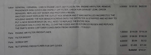 We authorized the cups and told them to leave the after treatment alone. After installing the cups we were notified that the truck was still doing the same issue. Turns out Injector number six was bad. Just as we suspected! They Also tried to charge us for a complete after treatment system that they ordered without our approval. Even though we told them we did not want it. $9,000 and some change for a system we did not need!!