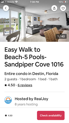 Read moreWhile I often rely on reviews to choose hotels or resorts, I find that I don't typically leave reviews myself. After staying at Sandpiper Cove, I knew that I wanted to rave about this place to anyone who would listen! If you are looking for an affordable getaway in Destin without losing out on the amenities of a highly rated hotel or resort, I absolutely recommend you check out Sandpiper Cove. First, let's talk location. Not only is the beach right across the road and within walking distance of any unit, the access is private, for Sandpiper guests only! There are chairs and umbrellas available (if they are not included with your unit, they are available to rent for either half or full day) as well as a restaurant/bar and super convenient ice machine right there on the beach. In addition, there is a Target Market (which has produce, meats, and a full grocery store ) right across the street so you don't have to drive to Walmart for anything you might need. Should you choose or need to go to Walmart or Publix, they are both conveniently located within 10 minutes of the resort. Next, let's talk pets. Destin is not known to be super pet friendly. They do not allow dogs on any beaches in the county and there are multiple resorts and hotels that do not welcome fur babies. Sandpiper, however, not only allows your four-legged babes to join you on your vacation, they welcome all sizes and breeds. We adopted Sasha, our Staffordshire Terrier, 3 months ago and did not want to leave her behind during our vacation. After searching high and low for a vacation spot that would allow our pup to join us, we finally found Sandpiper who welcomed her as quickly as they welcomed us. They have animal waste posts all over the resort and tons of green areas for them to walk and enjoy themselves just like you. Not to mention, tons of lizards for their chasing pleasure. :) Finally, the condo itself was lovely. We stayed in unit 1034, which was located in the back of the resort and on the end of the building. It was one bed, one bath and stocked with everything we needed for a 5 day stay including a washer/dryer, dish washer, full fridge and stove, dishes, silverware, cookware, coffee machine, etc. The owners also provided a blowup mattress that slept one (or two small children) easily, and a fold out bed in the couch. The bedroom had a very comfortable queen size bed and the bathroom featured a wonderful waterfall style shower head. We also found a small storage closet out front stocked with beach goodies including a small tent style beach cabana, beach chairs, and toys for the kiddos to play with in the sand. We were pleasantly surprised to learn that the owners paid for an umbrella and chairs on the beach so we didn't have to come out of our own pockets for that! If we didn't want to deal with the sand, we also had a pool basically in our backyard! It was one of three pools on premises and was clean and peaceful. The grilling area was also conveniently located next to the pool and had picnic tables and space for the whole family! My ONLY complaints about our stay were purely aesthetic. The toilet was placed behind the door to the bathroom making it a bit awkward to get in and out of, and the unit itself was a bit outdated. There was fabric on the front of tub (hello 1980), and the all the closet doors accordion style making it easy for little fingers to get caught. But honestly, that's just nitpicking for those who are expecting a totally renovated unit upon arrival. I cannot encourage you enough to check out Sandpiper Cove if you are looking for a great place to stay in Destin. I was ridiculously pleased with our experience (and the price!) and I have no doubt that we will be back...