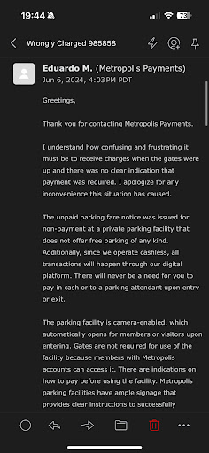 There is no clear signage anywhere within the parking garage stating that you need to have or setup a Metropolis Payments account in order to receive a bill for the parking fare. If you don’t have this account you will not get any bill until they mail you a late fee/unpaid parking notice.