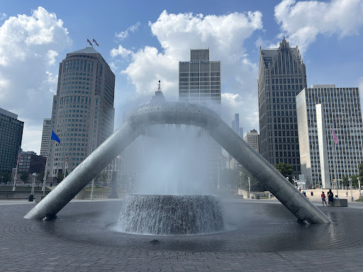 The iconic fountain has a history and it goes like this, Anna Thompson Dodge, widow of automobile pioneer Horace E. Dodge, bequeathed $2 million in 1971 to construct a fountain to honor her husband and son. The stainless steel, 30' high fountain sculpture is composed of a ring suspended between two inwardly canted supports and a black granite pool directly under the ring. Its powerful jets of water and dramatic setting combine to create a futuristic environment as the focal point of Detroit’s main civic plaza.