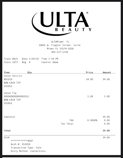 Read moreI have been a loyal Ulta customer for many years, getting my hair colored and cut at different locations (Kendall, Pinecrest, etc.) without any issues. Unfortunately, my recent experience at the Flagler location left me extremely disappointed.