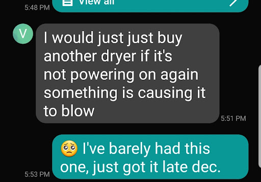 Read moreDo not purchase from this scammer. I bought a washer and dryer from them and my dryer didn’t work properly. I had a 45 day warranty and I noticed, (who I’m assuming is the owner) that my dryer wasn’t working. It only ran for 20 minutes then shut off. He said that he would replace it but never showed up. First he said 10am-12am and no show. Then after calling many times he finally answered said that his driver would be coming between 4pm-6pm, and that they were very busy but they would definitely come on said day. I had to end up canceling all my plans just for them to NEVER SHOW UP AND NEVER EVER GIVE ME A CALL. It is now 5 days since they were supposed to come and I have yet to receive a call or text from anyone. And I had I had a warranty but that means both to them. DO NOT SHOP...