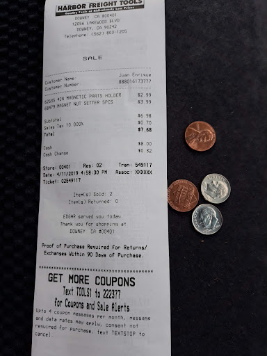 Read moreI heard about harbor freight from close friends. I had visited new location in Downey, ca. I like what seing while walking throughout the store and pick up several things. While checking out at register I told cashier I had left my coupon in car if he could wait to go crab it to get discount. He said no worries I could gave it to you anyway. I said that's very nice of you. I had purchase several items with large discount with coupon.so I trusted the cashier to keep his word by having me the coupon prices in the end he only gave me $13off of total bill. But when I had look at coupon just one items from my purchase should be discounted $20. I had went back to talk to manager what I came out to findout cashier was manager and clearly told me that discount with coupon. But that what said prior of purchase I could have move on side walk to my car and grab the coupon. So it said when you put trust in...