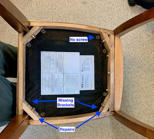 Quality Assurance: See pictures … there were 8 seat attachments when I delivered the chair to Lamar. There were only 6 attachments when he finished the work. Also, one of the attachments had no screw to bind it to the seat. This does not speak well towards your QA after finishing the brace repair, and I am concerned about how the missing pieces will affect the structural integrity of the chair. I sent Lamar my review before posting it and he responded (sic) “I did not put in the brackets because in the locations missing brackets, the screws would have materially weakened the corner braces which is possible why the chair failed initially. With the remaining clips your chair seat is firmly in place and does not need any more clips.“