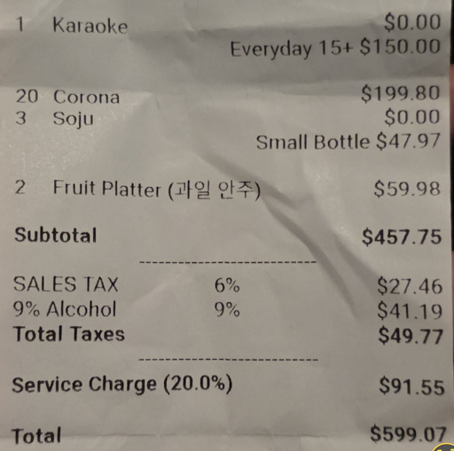 Once food was brought into the establishment, we sat down and continued to sing, but did not open our food. About 2 minutes later, the female host bursts into the room and starts yelling at us for bringing in food. We were all confused as to what we could've done to warrant such reaction. If the host stated that they did not allow outside food in the establishment from the beginning, we wouldn't have done so. Additionally, she could've just entered and stated that outside food was not allowed instead of coming in like we stole the Declaration of Independence. We stated that we didn't know outside food wasn't allowed inside and offered to take the food & kids out so that they can finish eating. We've also tried apologizing since we didn't know the proper rules of the establishment, as it was our first time there. The host then started to get very irate about the whole situation and told us to leave. We tried to pay for our time there since we did spend ~35 minutes there (33 minutes singing and a minute or so with the argument) and had 9 bottles of soju. The host then refused our payment and threatened to call the police while yelling at her other employees in Korean. We left after this statement was made since the host did not want us there.