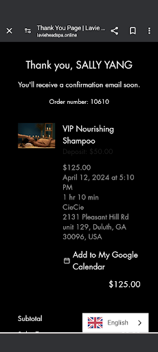 Read moreMy wife and daughter went together to Lavie head spa and my wife has not stopped talking about her experience. From the outside it does not look anything out of the ordinary. When you go in, there are murals of flowers etc. in the reception area which is pretty. Once you go in to the spa area there is a ceiling full of umbrellas with greenery along the walls that is charming. They were escorted into the changing area and given robes etc to change into. Then they went to the room where the “magic” happens. They soaked their feet while drinking tea and water. Next they were put in a warm bed with feet raised and heating pads for knees and stomach. My wife said Angel who worked on her and Mia who worked on my daughter were so sweet and nice. Angel noticed my wife taking pictures of my daughter and she took pictures and videos for them during the procedure. They had face, neck, shoulder and arm message with a facial in addition to hair washing and head message. My wife said Angel really got her head “super clean” with a very vigorous message and cleaning. My daughter said Mia was more gentle and will ask for a little more pressure next time. Finally, they got their hair blow dried and they spent the most relaxing 90 minutes in a long time. Thank you Angel and Mia for taking such good care...