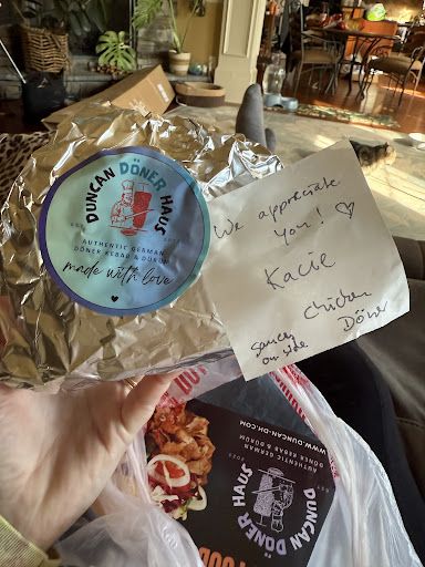 This was the happiest accident that could have happened, we were out running errands and my husband wanted Arby’s, I was going to get something but they didn’t have it. So I got home and started looking on DoorDash and saw the Duncan Döner Haus and had to try it out. I’ve never had a Döner before but I saw the reviews and thought why not? Best decision ever, they left sweet notes all over my food containers, gave me a pamphlet about Döners and it provides their website & food.