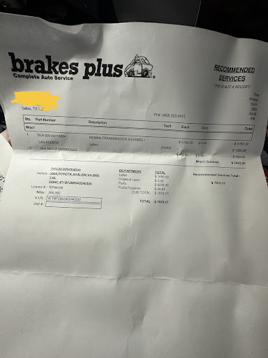 My next move was to take it to two separate transmission shops. There was no problem found with my transmission, but the transmission fluid was low, something that I'm assuming should have been caught by Brakes Plus since I took it there to have the transmission assessed.