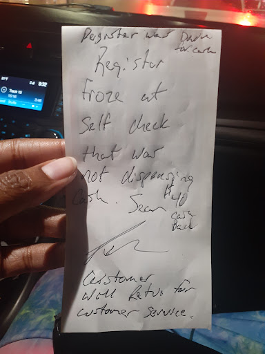 I stopped and explained to Sean what happened and that we just needed a receipt for proof that The groceries were paid for. (The payment was accepted) That she was owed $40 cashback And hopefully have a smooth transition the next day when customer care is open to receive the cashback. I walked behind him back to the register.